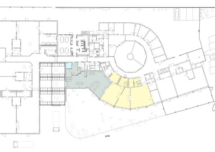Diesmal ist der Heilpädagogische Arbeitsbereich für eine weitere Gruppe von Beschäftigen umzugestalten. Die Räumlichkeiten befinden sich im Bereich zwischen dem polygonal aufgefächerten Altbau von 1994 und dem kubischen Anbau von 2011. Für die besondere Benutzergruppe mit diversen Einschränkungen gilt es eine Umgebung zu gestalten, die sowohl mit Helligkeit und sanft farbigen Bereichen aktive Tagesabläufe, als auch mit tamisiertem Licht kleinere Rückzugsräume anbieten kann. Der Altbau hat einen hervorragenden Bezug zum Außenraum, der ihm hohe Aufenthaltsqualität mit Blickbeziehungen ins Grüne und viel Licht gibt. Das aufgefächerte Dach und Teile der Fassade müssen in seinen Dämmeigenschaften dem Klimawandel angepasst werden.