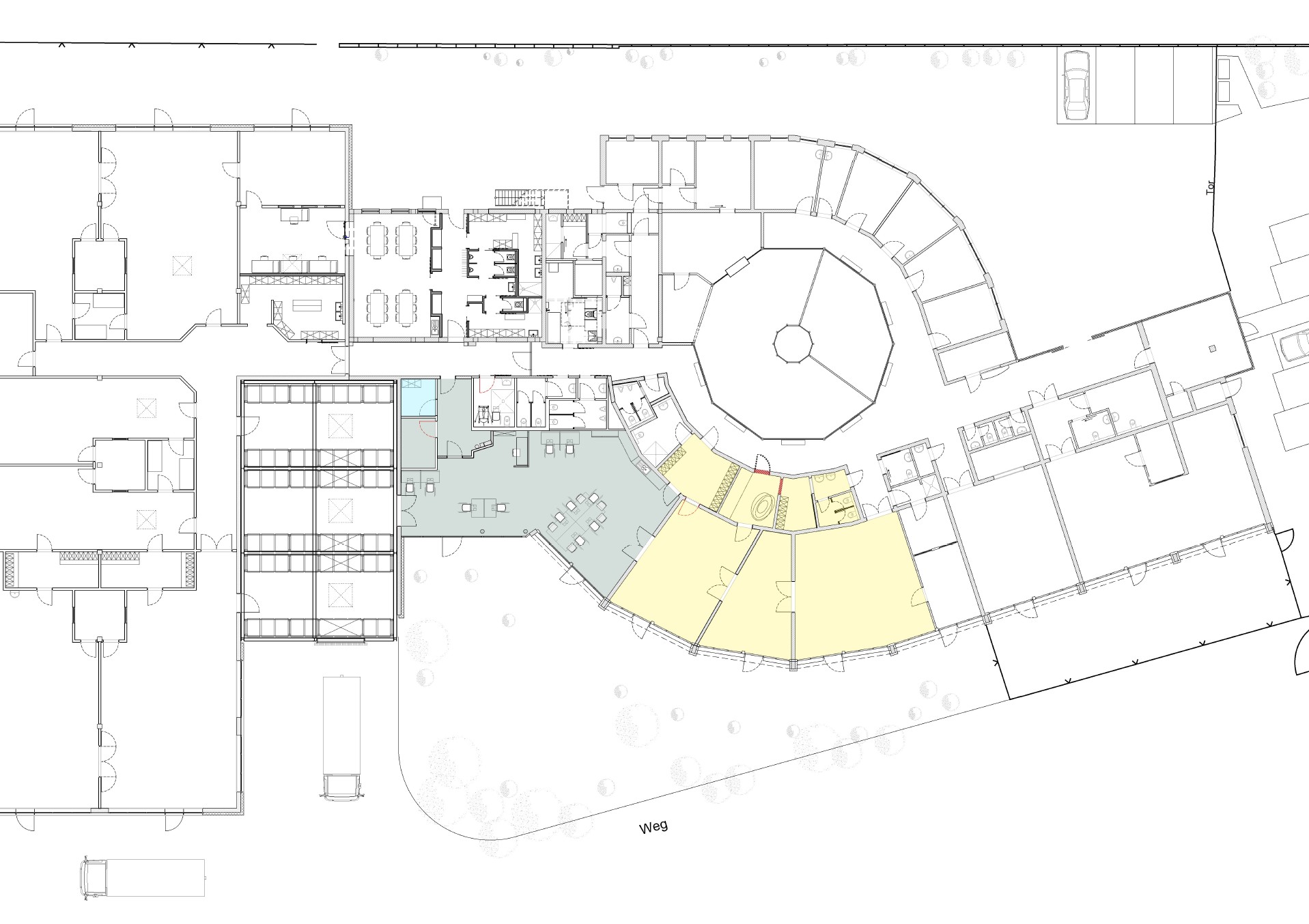 Der zentrale Altbaubereich mit dem Speisesaal der Kantine soll vergrößert werden. Das alte, konkav nach innen gestülpte Dach hat aktuell eine drückende, dunkle Atmosphäre. Der Raum ist vor lauter Stützen und Trennscheiben baulich kleinteilig segmentiert. Er soll mit einem neuen, konvex nach oben aufgerichteten Dachstuhl mit umlaufendem Lichtband und einem mittigen Oberlicht eine helle, stützenfreie und zentrale Funktion für die Gemeinschaft aller Beschäftigen im Gebäude wieder bekommen.
