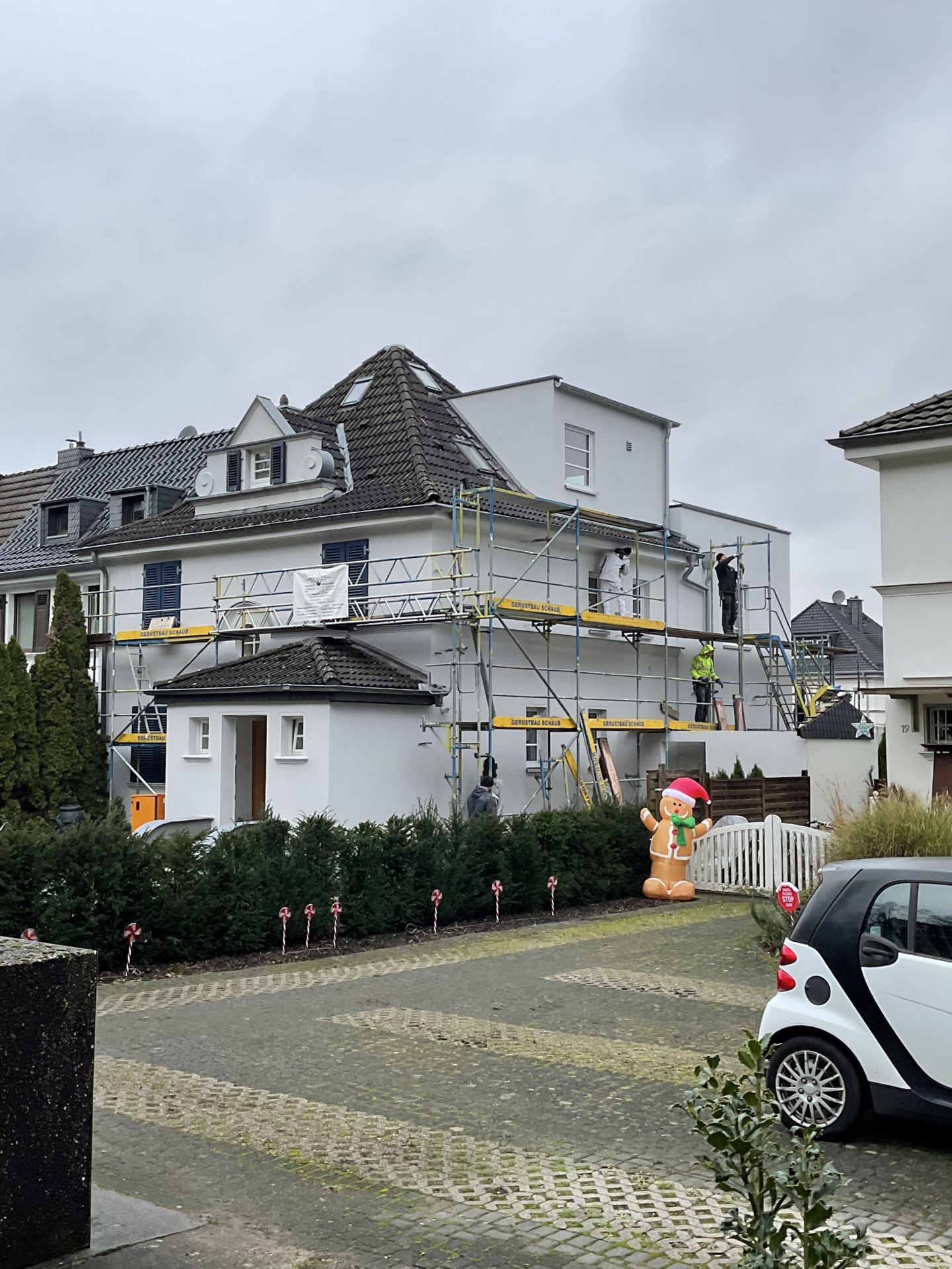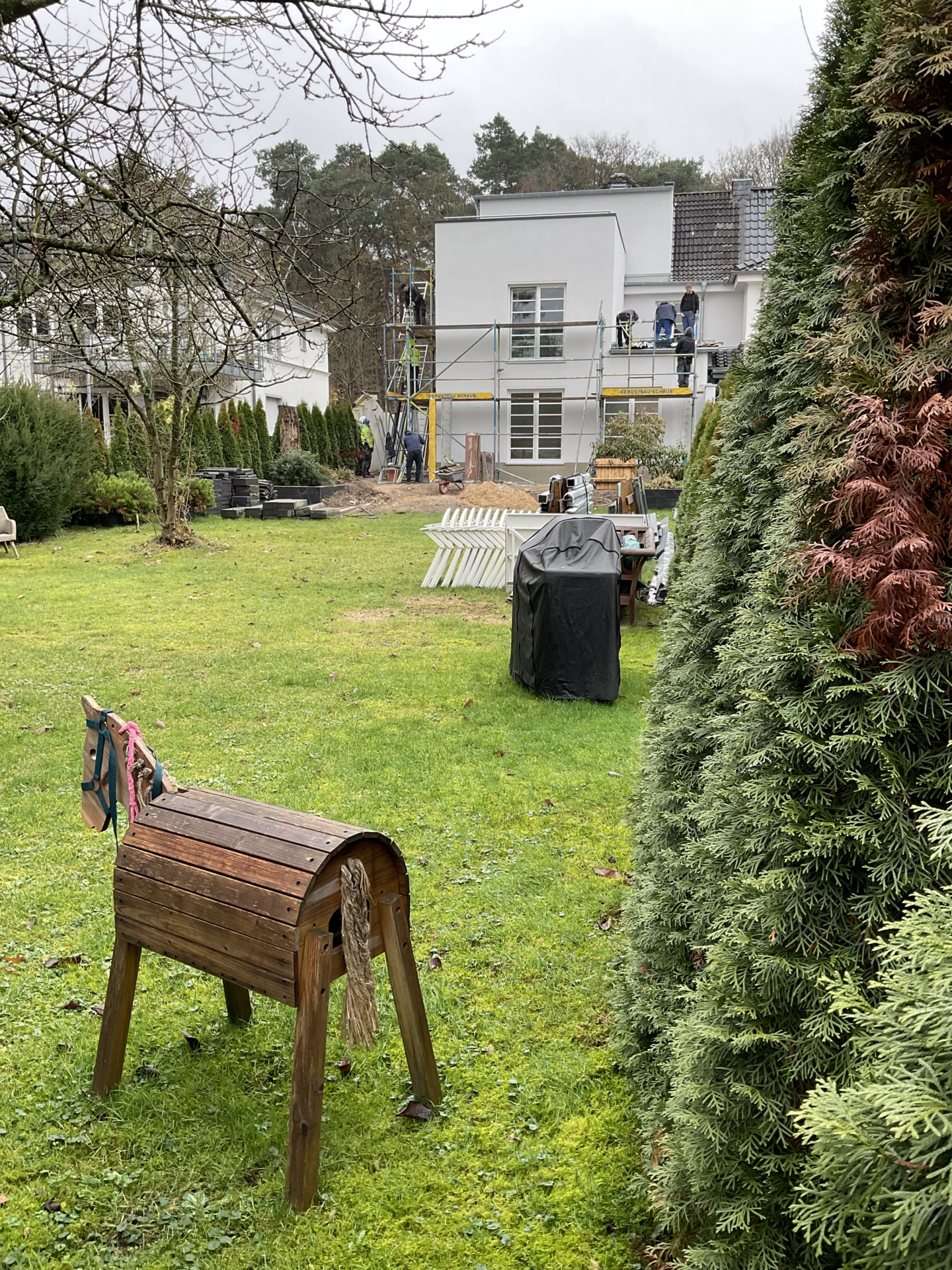 Die Kölner Göttersiedlung besteht am Rand zum Königsforst aus diesen typischen Häusergruppen aus drei Einfamilienhäusern mit großen flankierenden Zeltdächern mit Schmuckgiebeln und betonten Dachüberständen. Die Grundstücke wurde in den 30-er Jahren als schmale, lange Selbstversorgerparzellen angelegt und der Bebauungsplan betont mit einer GRZ von 0,2 die dünn bebauten Grundstücke um den grünen Charakter des Gebiets zu erhalten. Die vielfältige gestalterische Rahmenbedingungen wurden beim Umbau ausgeschöpft und neue Volumen vor allem zum Garten zugewandt eingefügt. Für eine veränderte Familiensituation wurden zwei separat nutzbare Wohneinheiten mit möglichst sparsamen Eingriffen im Innenraum umgestaltet. Der Anbau zum Garten nach Nord-Ost schafft den zusätzlich benötigten Raum mit einem weiten Blick in den herrlichen Garten mit Obstbäumen und Zypressen. Im Erdgeschoss konnte damit eine eigenständige, stufenlose Wohnebene im Grünen geschaffen werden.