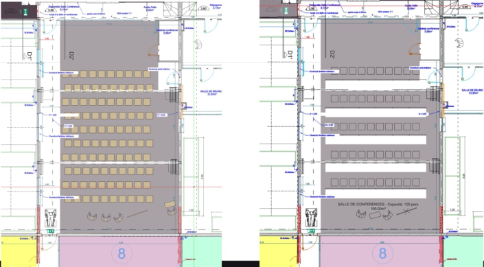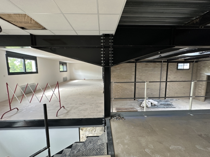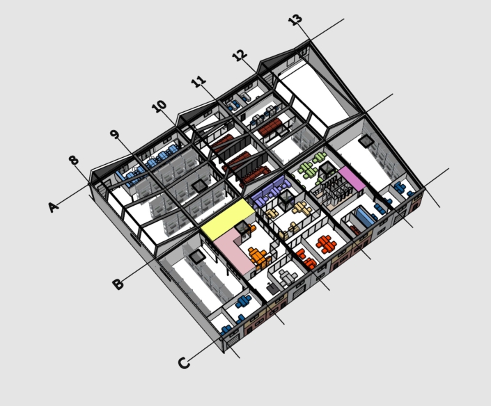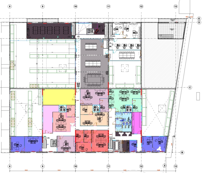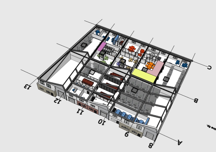 Der große Industrieneubau am Rande einer Kleinstadt in der Nähe von Paris war ursprünglich mit seinen 50 x 40 x 7m in zehn Schotten à 20m Tiefe unterteilt, um hier unterschiedliche, kleinere Firmen nebeneinander anzusiedeln. Die Firma PREVOR hat -bis auf eine- alle Schotten gekauft, um dort ihre neue Abteilung Dressilk® aufzubauen. Die Produktion für dieses innovative, inhouse entwickelte Wundheilungstextil auf Basis von Seide wurde im Erdgeschoß von speziellen Fachplanern geplant. Atelier Fouquez wurde beauftragt im Obergeschoß die elf unterschiedlichen Abteilungen in spezifische Bürobereiche, Prüflabore, Cafeteria, Konferenz- und Schulungsbereiche barrierearm in die Gebäudehülle einzupassen. Dabei wurde auf eine helle, akustisch optimale Raumqualität geachtet, die den Bezug zum Material Seide und der umgebenden Natur ins Gebäude einbindet.